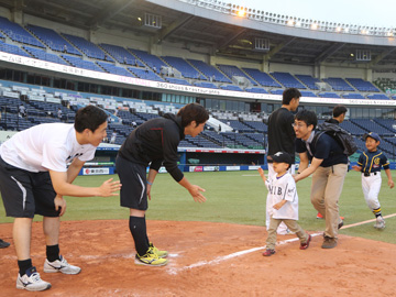 試合終了後、選手がベースランニングに登場!選手がスターターや各ベースでの応援、ホームベースでのお出迎えをします!