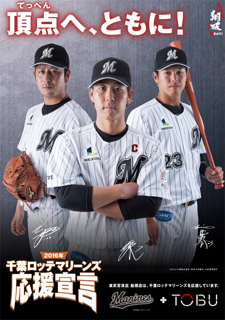 2016年プロ野球公式戦が開幕!!東武百貨店船橋店は、今シーズンも皆様と共に千葉ロッテマリーンズを応援してまいります。 東武百貨店船橋店では、3月31日(木)~4月6日(水)に「千葉ロッテマリーンズ応援宣言」セールを開催いたします。観戦に役立つグッズや、全館でお楽しみ袋・お買得品等を多数取り揃えいたします。また、マリーンズが試合に勝った翌日限定で行われるサービスも実施いたします。この機会をお見逃しなく!!