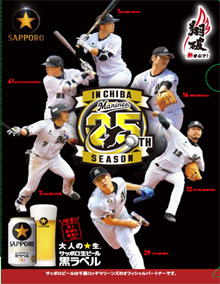 | 賞品 | ![]() 1等 選手直筆サイン入りレプリカユニフォーム&サッポロ生ビール黒ラベル350ml缶 1ケース 3名様 ![]() 2等 QVCマリン内野指定席Sペアチケット & マリーンズ選手直筆サインボール&サッポロ生ビール黒ラベル350ml缶 6缶セット 3名様 ![]() 3等 サッポロ生ビール黒ラベル350ml缶 2缶セット 300名様 ![]() 千葉工場賞 千葉ビール園ジンギスカン食べ放題と生ビール飲み放題のペアチケット 10名様 特別賞 サッポロ 麦とホップ The gold「サッポロビールは千葉工場でつくっています」缶 350ml缶 1ケース 5名様
