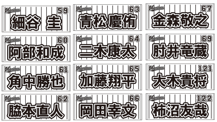 | 新発売選手 | #00高濱、#2根元、#10大松、#14大谷、#15関谷、#18藤岡、#20東條、#21内、#25金澤、 #27古谷、#28松永、#30伊藤、#31田中英、#33南、#34木村、#35寺嶋、#36川満、#37三木、 #40吉原、#41成田、#42香月良、#43黒沢、#44井上、#46岩下、#47田中靖、#48宮崎、 #50大嶺翔、#51信樂、#52益田、#53江村、#56原、#57香月一、#58高野、#59細谷、#60阿部、 #62脇本、#63青松、#64二木、#65加藤、#67金森、#69肘井、#121大木、#122柿沼 |
