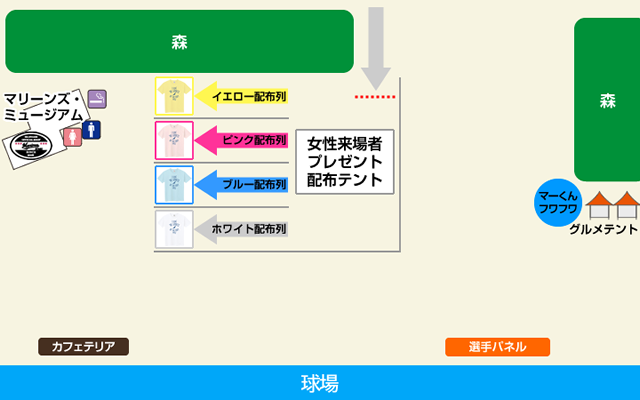 | 参加方法 | マリーンズストアプラザ店(球場外店舗)にて対象のタオルをご購入いただいた女性先着100名様に参加券をお渡しします。 ※球場内ホームプレート店は対象外です。 |