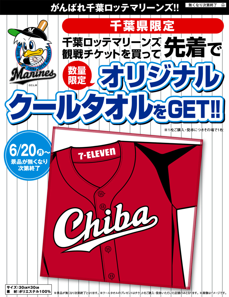 6月20日(月)より千葉県内セブン-イレブン各店舗にて「がんばれ千葉ロッテマリーンズ!!応援キャンペーン」を開始いたします。千葉県内セブン-イレブン店舗にてQVCマリン開催の千葉ロッテマリーンズ公式戦チケットを発券いただいた方に先着でオリジナルクールタオルをプレゼントいたします!!キャンペーンは各店舗予定数に達し次第終了となります。