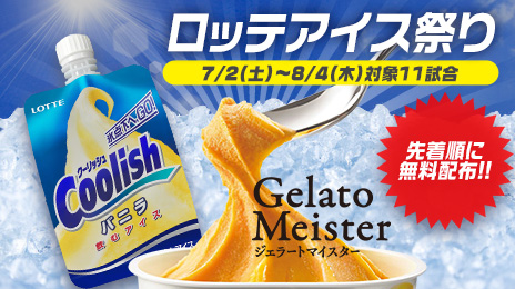 7月2日(土)から8月4日(木)までのホーム開催試合のうち、対象11試合でロッテ「クーリッシュ」「ジェラートマイスター」を先着順で来場者に配布します。