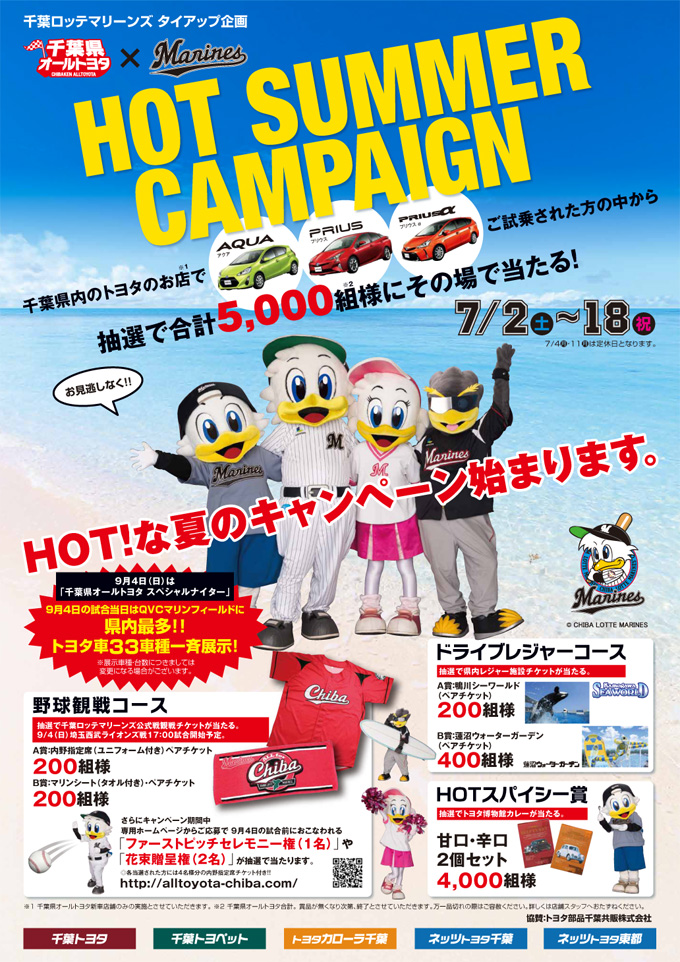 千葉県内のトヨタ店合計207店舗の販売店と、トヨタ車を幅広いユーザーの皆様により身近に感じていただくため、県内各販売店でご試乗いただいたお客様の中から、抽選で5,000組にマリーンズ戦観戦チケットをはじめ、夏休みにピッタリな賞品をプレゼントします。