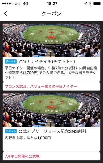 | クーポン | アプリ限定の球場で利用できるクーポンも配信しています。 |
