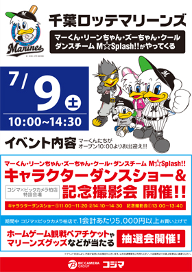 ビックカメラ×コジマ柏店にてマーくん・リーンちゃん・ズーちゃん・COOL・M☆Splash!!によるキャラクターショー・写真撮影会を実施いたします。 是非この機会にビックカメラ×コジマ柏店にご来店ください。