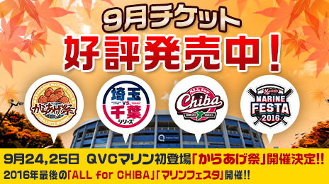 いよいよシーズンの佳境を迎える9月開催。イベントでは「埼玉vs.千葉シリーズ」「ALL for CHIBA」「マリンフェスタ2016」を開催するほか、QVCマリン初登場「からあげ祭」の開催も決定!!人気試合はお早めに!!