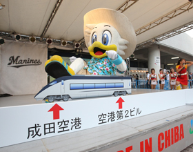 | 内容 | スカイライナーに模した台車に子供が乗って、後ろからお父さんお母さんが押して走らせます。成田空港にピッタリ届いた親子には素敵な賞品をプレゼントいたします。 |