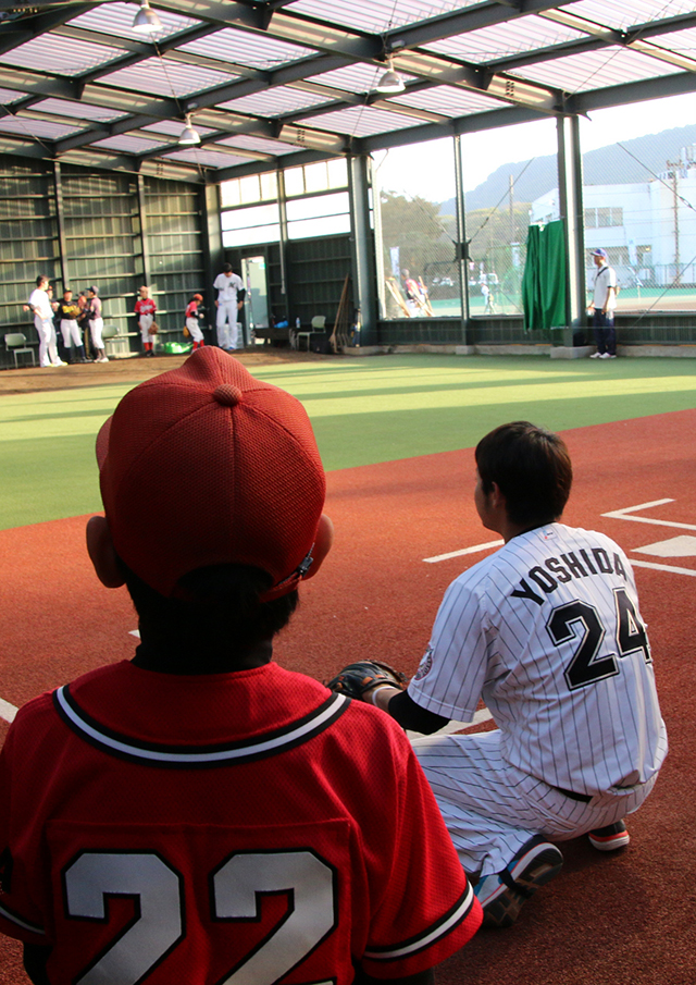 練習後は、毎年恒例となっている野球教室を開催。地元のチームを中心とした約150人の子どもたちが参加しました。
