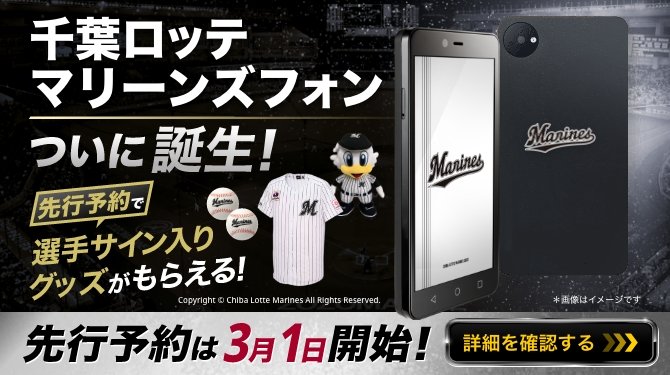 今回のスポンサー契約締結に伴い、マリーンズとコラボしたスマートフォン「千葉ロッテマリーンズフォン」を販売することが決定。3月1日(水)から選手の直筆サイン入りグッズがもらえる先行予約キャンペーンを開始します。