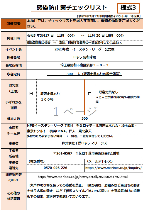 今季、ロッテ浦和球場で開催されるイースタン・リーグ公式戦は、埼玉県が定める「イベント開催時のチェックリスト」に基づく感染防止対策を実施したうえで有観客試合として行います。