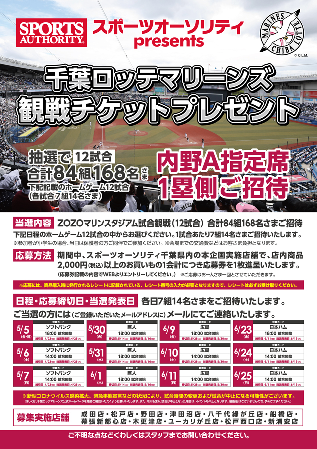 マリーンズのオフィシャルスポンサーでもあるスポーツオーソリティでは「観戦チケットプレゼント」キャンペーンを実施中です。