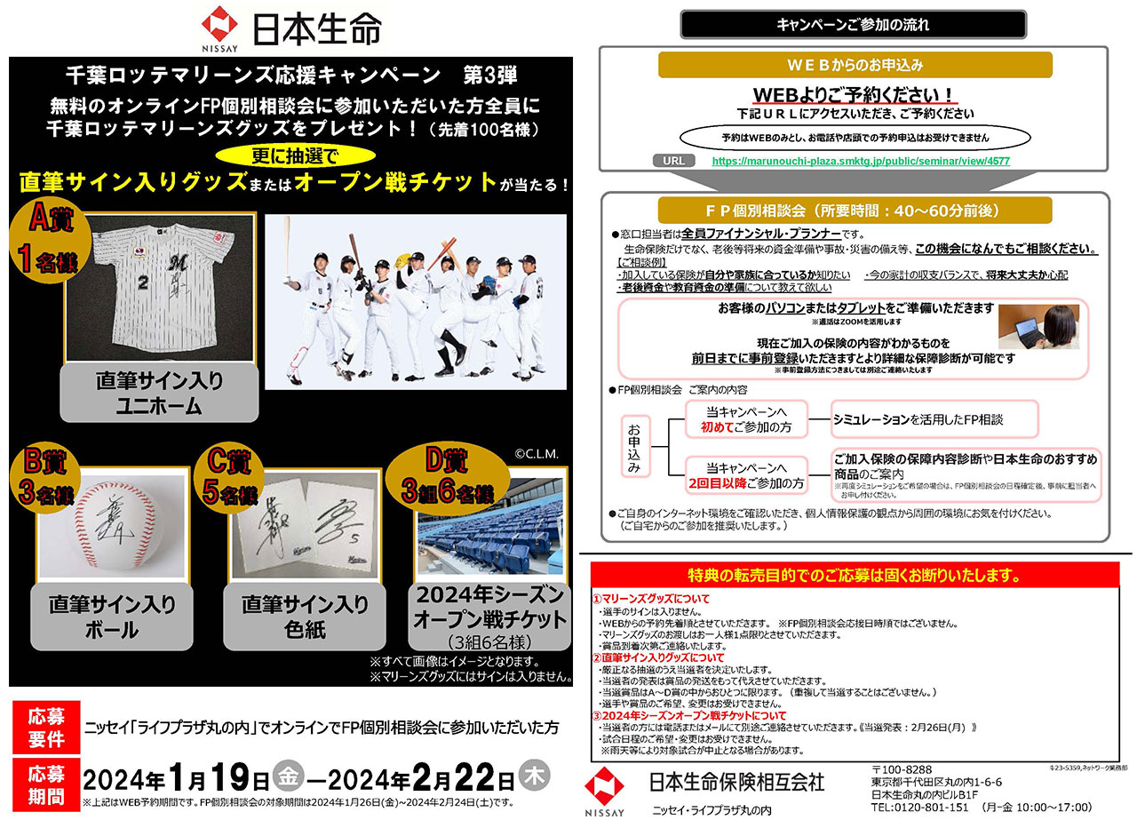 日本生命のファイナンシャルプランナーとのオンライン個別相談会に参加した方、先着100名様にマリーンズグッズがもらえるキャンペーンを実施します。さらに抽選で直筆サイン入りグッズなどが当たります。ご予約はお早めに!