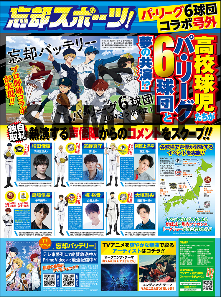 「忘却バッテリー」とパ・リーグ6球団のコラボを特集した「忘却スポーツ新聞 号外」を入場ゲートでお渡しします。出演声優陣からのコメントが掲載されたコラボ試合限定の号外をぜひ、お受け取り下さい。