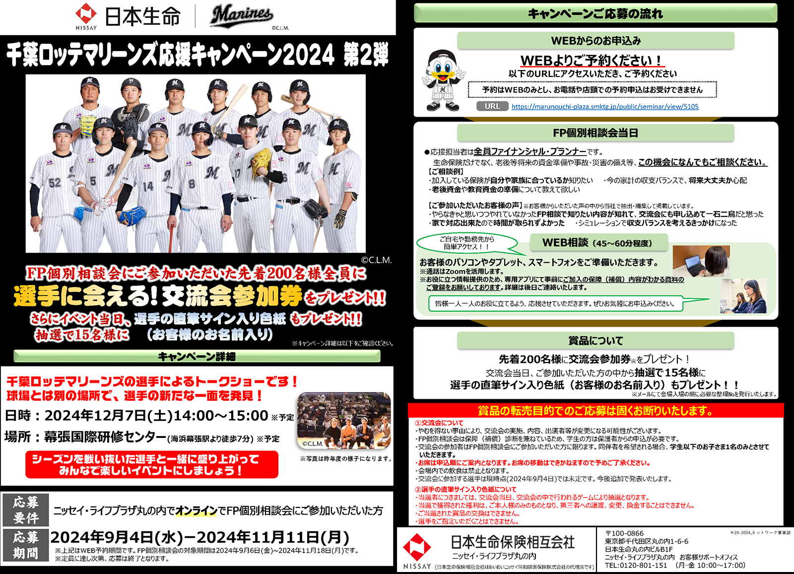 日本生命のファイナンシャルプランナーとのオンラインによるFP個別相談会にご参加いただいた方をマリーンズの選手に会える交流会にご招待します。交流会参加券は先着200名様にプレゼント。ご予約はお早めに!