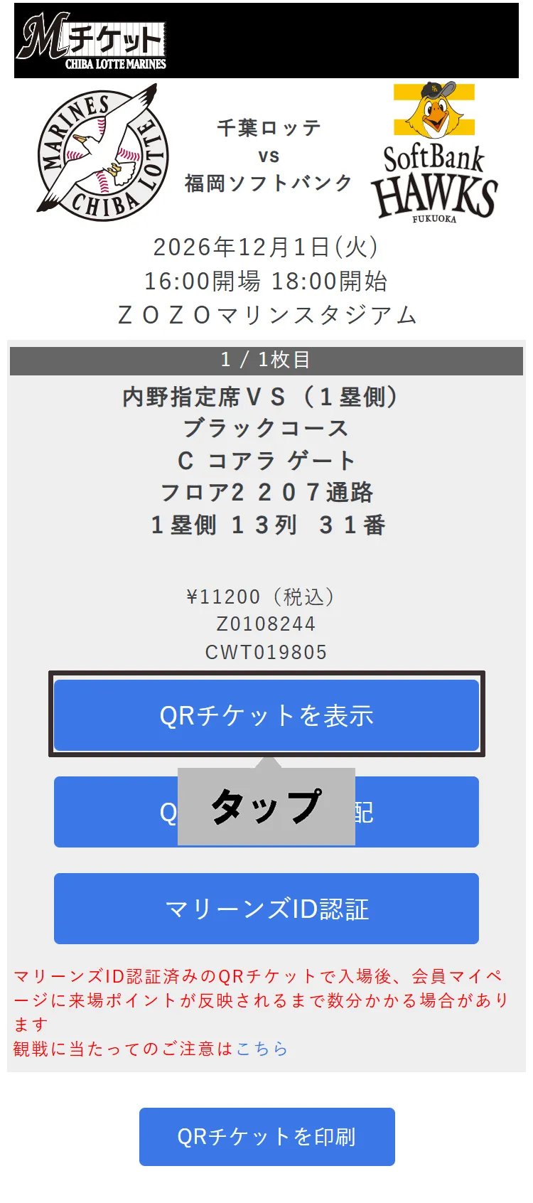 「QRチケットを印刷」を選択してください。試合当日は印刷したQRチケットを持参の上、記載の入場ゲートまでお越しください。