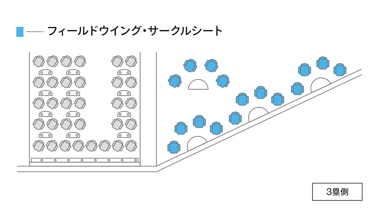 内野席エリアの前方で鴎の翼のように広がるフィールドウイングエリア。4名掛けで楽しめるグループシートをご用意しました。